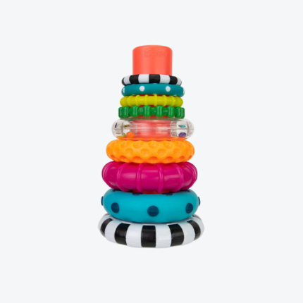 - Chunky rings make it easy for baby to grasp, strengthening fine motor skills